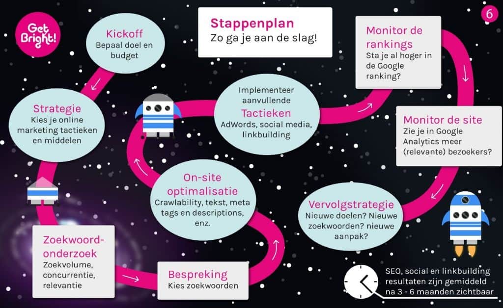 Voordat je daarmee begint wel eerst even je strategie bepalen en zoekwoordonderzoek doen. En onderweg natuurlijk meten of je voldoende progressie boekt: hoeveel extra bezoekers leveren de traffic bronnen op? Op basis van de metingen stuur je bij.